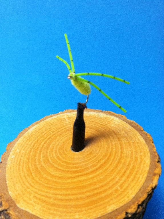 Wings: Two pieces of 1 7/8-inch medium, round rubber hackle trimmed after the fly is completed to equal length. After trimming each leg is about 7/8 inch in length if tied on a size 10. Color matches body and thread