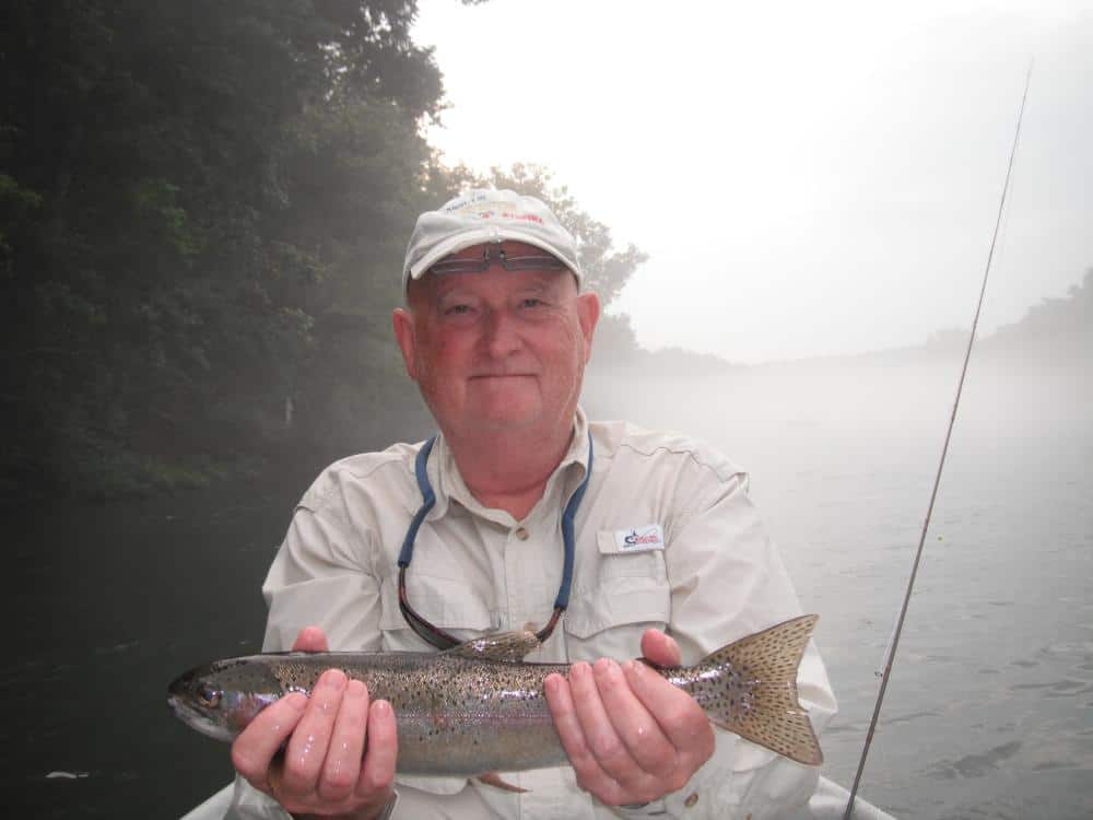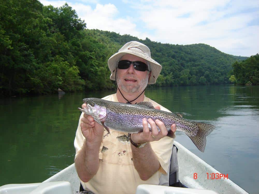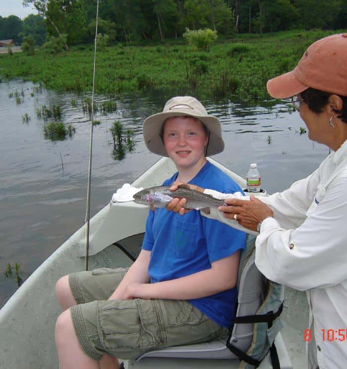 Friday, Darrell took Mark and Nikkie out for the morning.  Another bunch from Texas.  Mark has always wanted to try fly fishing and I think both of them liked it…..even the one on the way.  Nikkie is seven months pregnant and I think the baby boy will take to fly fishing as soon as he can hold a fly rod!  Their best pattern was the red San Juan worm.  Carolyn had Bob, from Washington, and his grand daughter, Courtney, from Springfield, out for half a day.  Grandpa fishes the rivers in Washington and Oregon and was quite impressed with the quality of fish we have in Taneycomo.  Hopefully, we have a new fly fisher in the works.  This was Courtney’s first time with a fly rod and she did pretty darn good.  Best patterns were the cerise or red San Juan worms, holographic green crackle back and a rockworm caddis soft hackle.  We saw some rises in some slack water and Bob picked off several of these with the soft hackle or crackleback before they stopped.