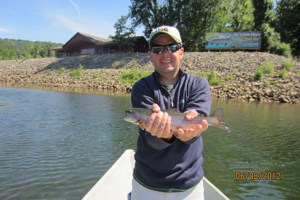 Carolyn had JP and his father, George, from the Kansas City area on the water Friday. We started out with the size 18 rusty midge and JP caught a nice 17-18 inch rainbow. He escaped before we could get a picture. Once the fish layed off the rusty, it was the size 18 ruby. Stan was out with Bob from here in Branson. They too, did best on the ruby midge. John, also from Branson, was with Jim. They had a good day on the ugly midge, a size 18 gray scud with a blood