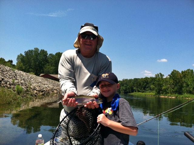 How about that for a great father/son team?  Gina had Hunter and his father out again on Tuesday.  Hunter hooked up with some fish, but had more fun netting his father’s fish.  Slow start, but after the water came on and it settled out a little, they had a good full day on the ruby midge under the fur bug, a P&P and the big ruby.  Stan had another father/son out.  Fred, and his son, Troy, from Nixa spent the morning catching fish on the primrose & pearl midge.  And the last father/son group was with Jim.  John and Joshua, from Ballwin.  These new fly fishers caught most of their fish on the CQ streamer.