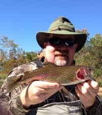 out all day, Dale and Glenn. Dale brought in this nice 19-1/2″ rainbow. They had a good afternoon on the P&P midge, a size 14 crackleback and the CQ streamer. Didn’t get enough on Saturday, so they went out again Sunday morning. Another good outting for these guys on the P&P and little ruby midges.
