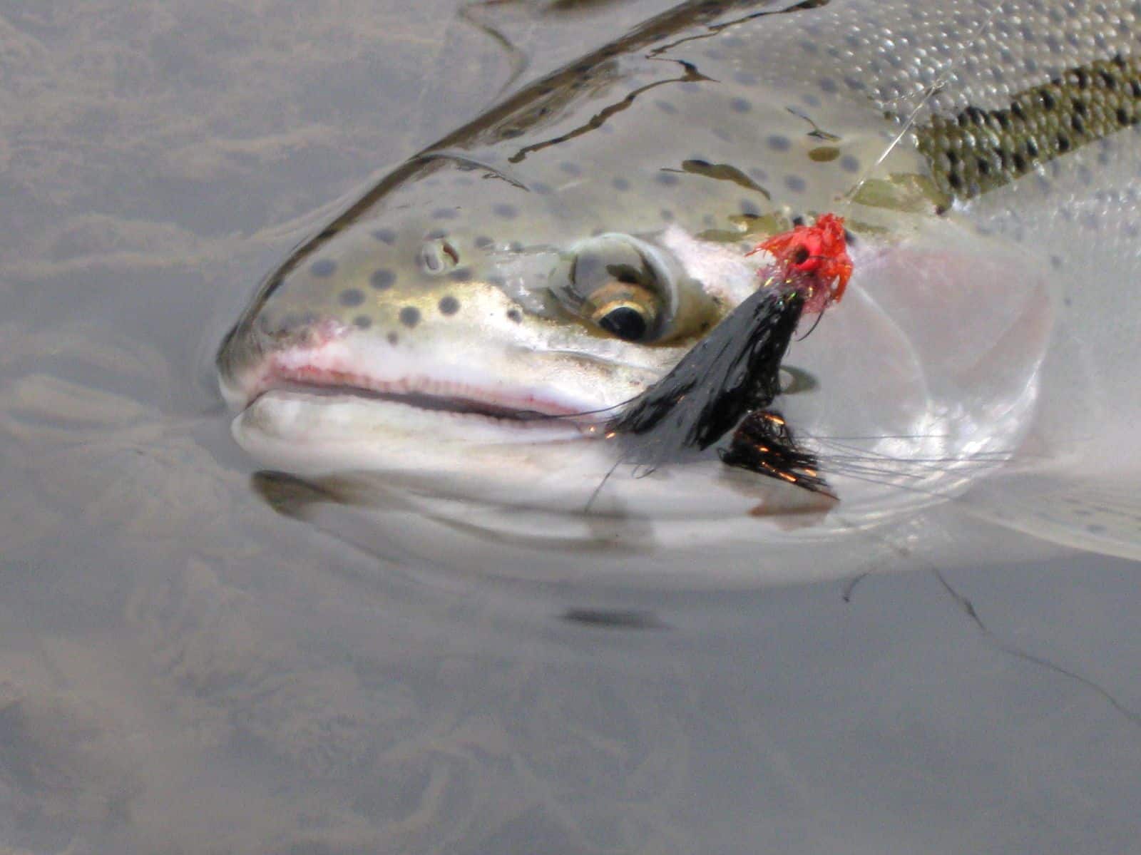 New Year’s Day was definitely slower for most of us. Guess it depended on where you were. I spoke with one of our customers this morning and he said they had a great day in the gauntlet area around the big stump. Spoke to others and they had only caught a few in several hours. We fished for a little while (how long does it take for your fingers to freeze?…about that long). We would catch a couple on this fly, holographic green crackleback; and a couple on another fly, etc. Best pattern with most fish was the size 18 copper dun midge. However, we were fishing the Rockin Chair area and below.
