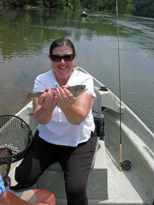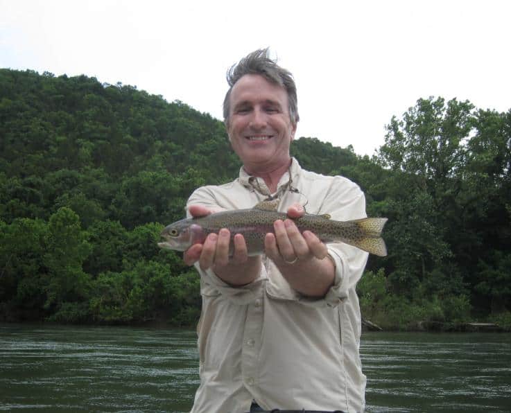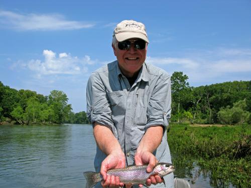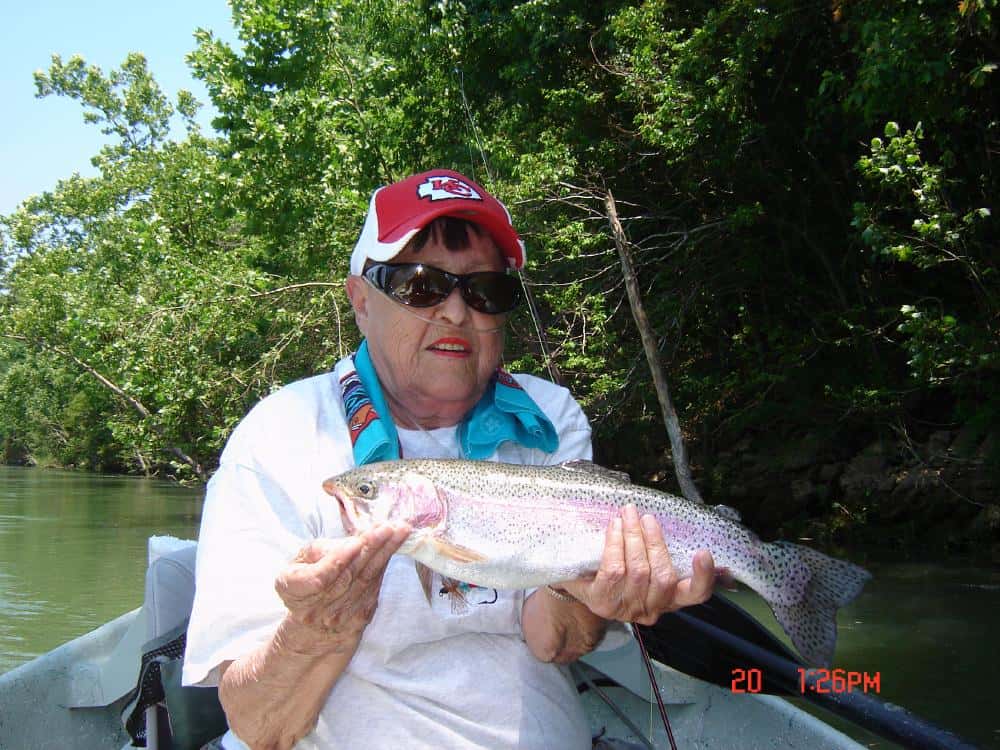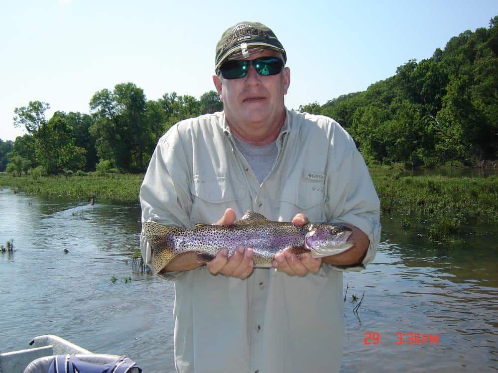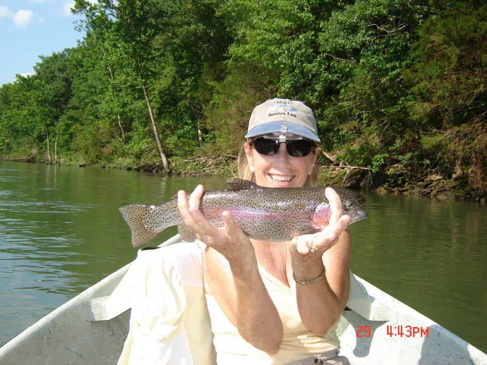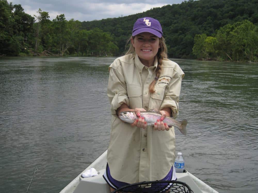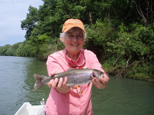 A lot of boats on the water Friday and Saturday. Jim out with Alec and Jim, from Manchester, MO. on Friday. This is an annual event for the two of them. Had a good day on the black bug-eyed bugger, size 6, the red midge and a pink San Juan worm. Scott and his son, Mitch, spent the morning floating with Stan. Mitch was only 7 or 8 the first time he fished with us. He is now 12 and throwing a pretty good rod, but best of all, he’s hooking, playing and bringing landing those fish really good now. Their best patterns were the red midge, an olive wooly bugger and a cerise San Juan worm. And now, for the rest of the story…..the Louisiana Kerrs were in town. Darrell took Albert and James Albert. They quietly had a good day on the red San Juan worm. Hidden away in the trees along the bank you could hear cackling, hoots and hollers. Carolyn had Dawn and Gina in her boat all day. Gina dubbed them “Triple Trouble”. Fun day on lots of stuff. Never stuck with anything long enough to say something was consistent, but seemed nothing was consistent. You either needed to change flies after three or four fish, or change location. Caught fish on the 56er stripping under sinking leader, black bugger, olive floozie (of course), cerise San Juan, red San Juan, egg patterns, red midge, Eggi Juan Kenobi. Think the only thing we threw that did not even get a hit was a white wooly bugger.