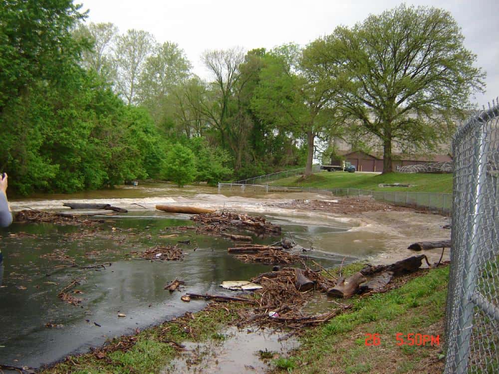 Looks like there will be a lot of clean up after the water goes down. Following pictures are of the parking area at outlet 2, the parking upsteram at outlet 1, and the shelter house and restroom below outlet parking area.