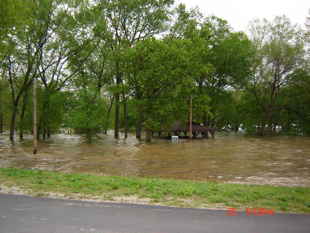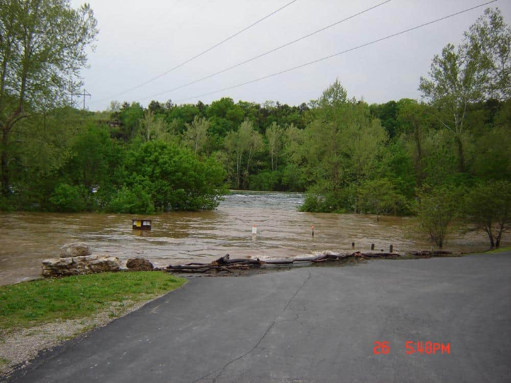 The Corp turned on the ten flood gates Monday, 4/25/11 at 2:00 p.m. Receiving information that they plan to increase the amount of flow today, which will take the level into “new territory”. No rain today, but chances again this evening. Also chances over the weekend. Beaver, the lake feeding into Table Rock, was slightly above flood pool, at 8:00 a.m. today. Table Rock was at or slightly above flood pool (930 feet), and Bull Shoals (receives all our water), was at 671 feet. Their flood pool is 695. As we experienced in 2008, this too shall pass. However, we hope the amount of damage to people’s homes and other property is minimal. Let’s hope for the best! To be continued………