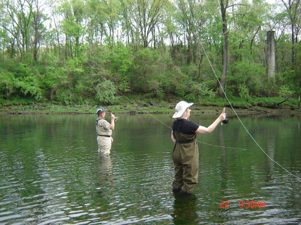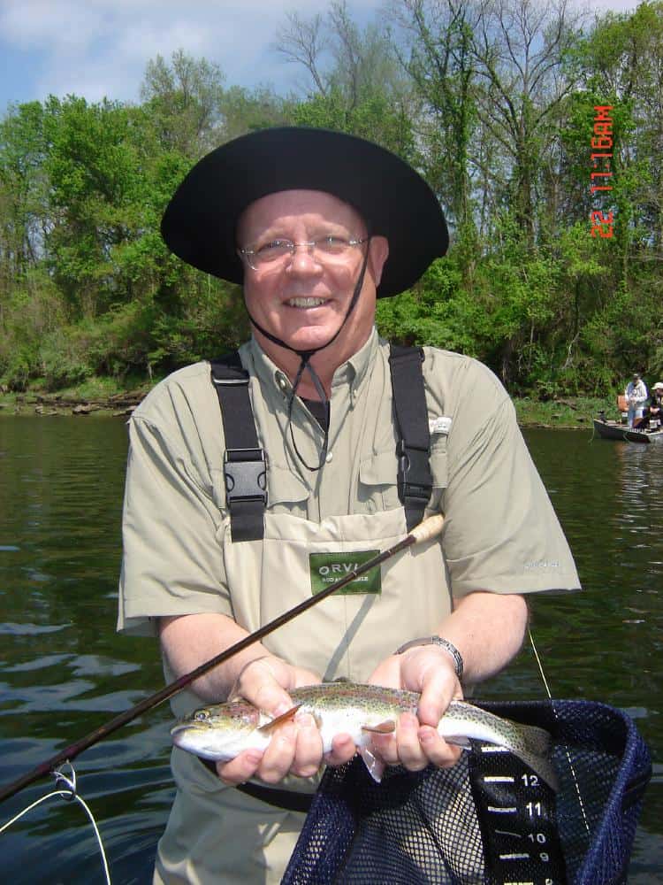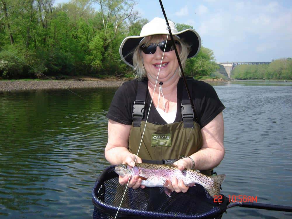 Friday, Ken and Cindy, from Maryland, took a learning/catching trip with Carolyn. They had never fly fished before, saw lots of people catching fish earlier in the week on Taneycomo, and thought this looked like a fun thing to do. Think they like it! We started out with the basics, roll cast, then pick up and lay down cast, mending, recognizing a hit, hooking, and playing in a fish. What fun! Unfortunately, before we got off the water, the wind came up and I think at times they thought tippet and leaders were spider webs trying to wrap around everything in sight! Good day on the copper dun, then the primrose & pearl and finished up with the ruby midge. Cindy is a potential “stripper”. She liked stripping the holographic green crackleback on which she caught several fish.