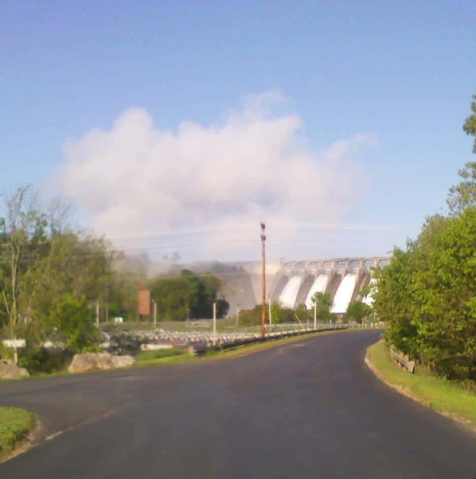 Below is a picture of Table Rock Dam after they increase the amount of water being released through the flood gates from the day before. This happened around noon on Tuesday.