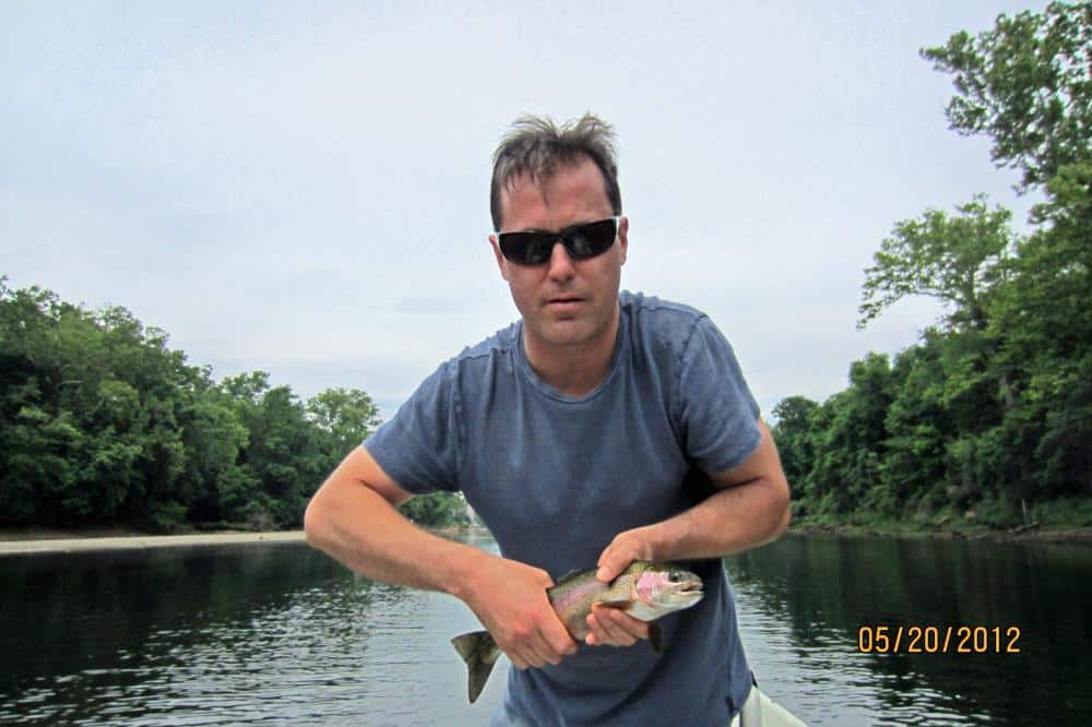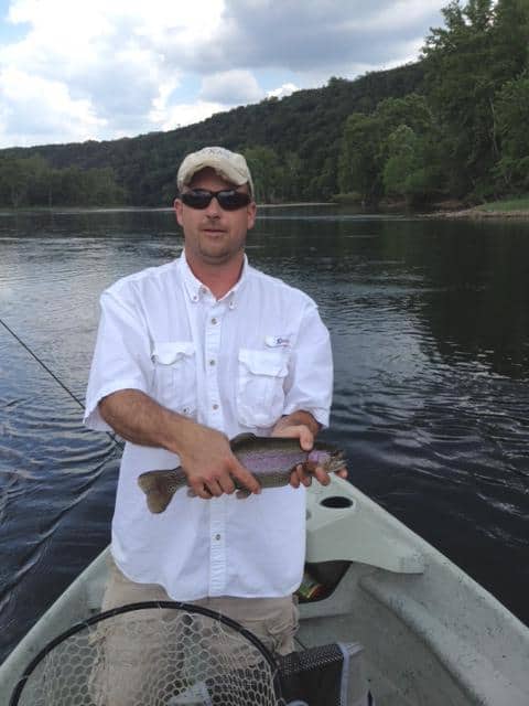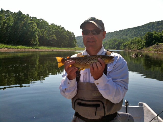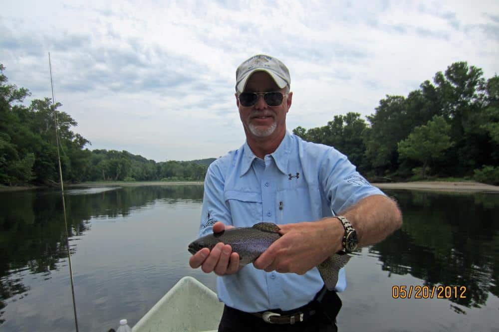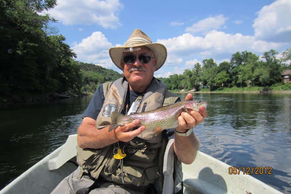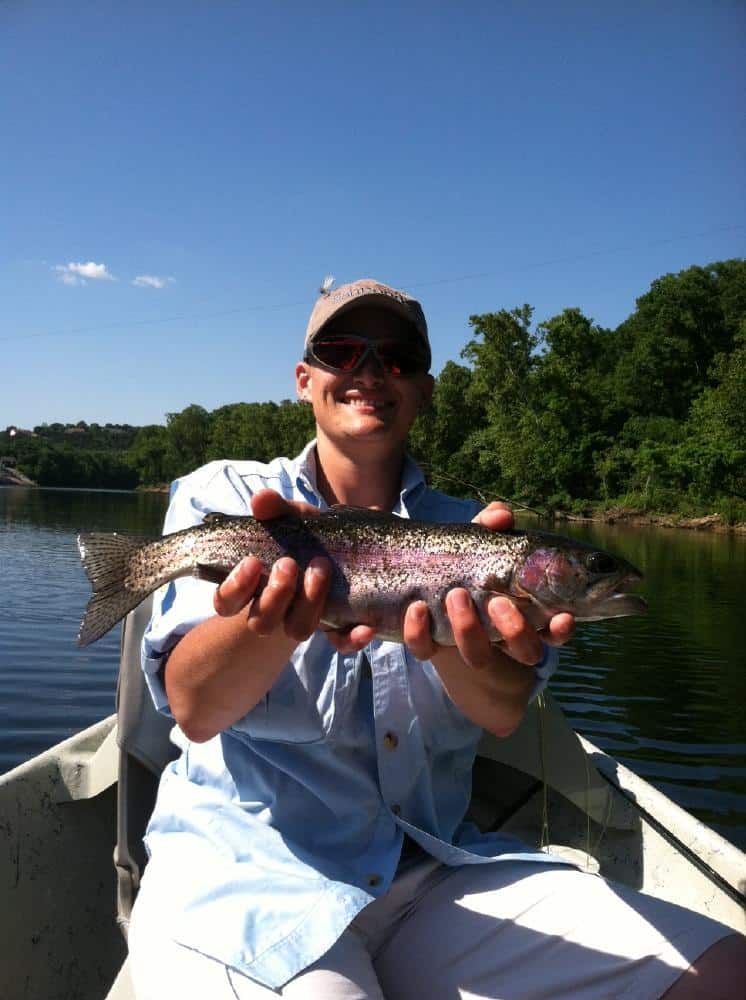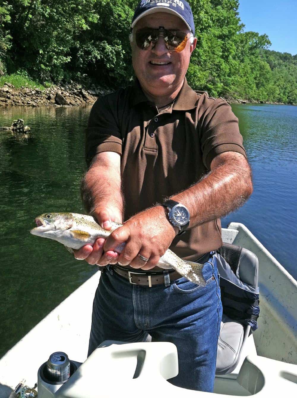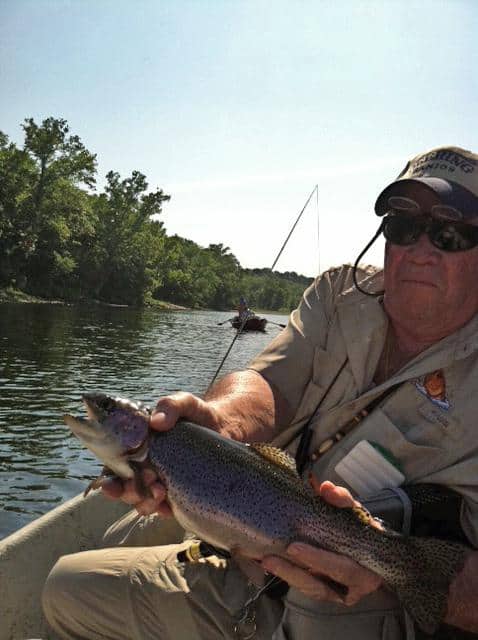 Carolyn had JP and his father, George, from the Kansas City area on the water Friday. We started out with the size 18 rusty midge and JP caught a nice 17-18 inch rainbow. He escaped before we could get a picture. Once the fish layed off the rusty, it was the size 18 ruby. Stan was out with Bob from here in Branson. They too, did best on the ruby midge. John, also from Branson, was with Jim. They had a good day on the ugly midge, a size 18 gray scud with a blood