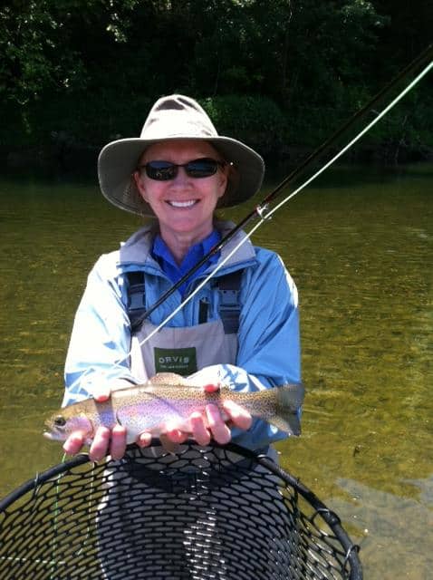 Karen’s first time fly fishing was last October. This year she came back with a life-long friend, Mickey, and the two of them spent half a day last Monday with Carolyn. This was Mickey’s first time fly fishing and she caught on quickly, as did Karen on her first trip. We had a fun and good catching day on the water using the size 18 ruby midge and